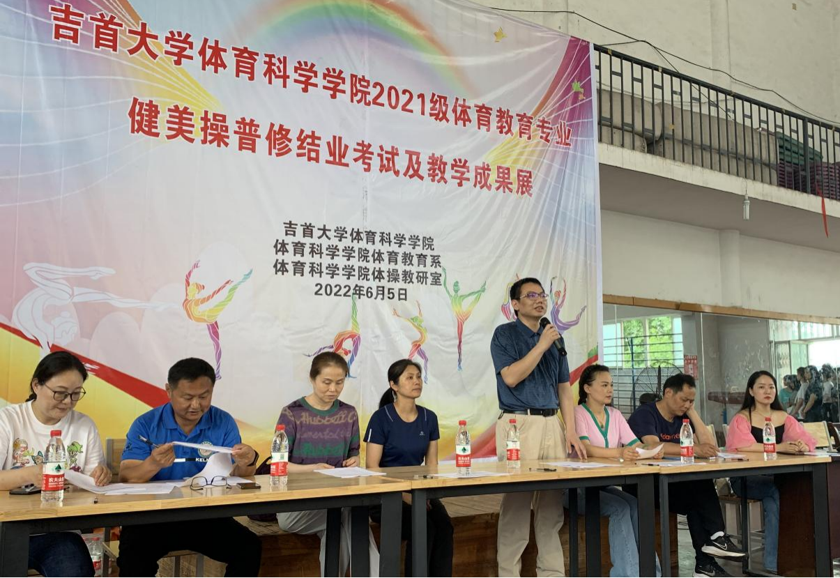 2022年6月5日14:30点,英国威廉集团官网体操教研室在体操馆举行2021级体育教育专业健美操普修结业考试及教学成果展活动。学院副经理万义、体育教育系主任文理中老师、体操教研室主任朱晓红老师、学院教务办王月英老师、体操教研室陆晨教授、王海波老师、田茂林老师、刘生贵老师和覃英老师出席了本次汇报展演。