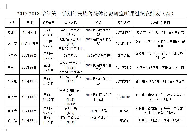 2017-2018学年第一学期年民族传统体育教研室听课组织安排表(新)