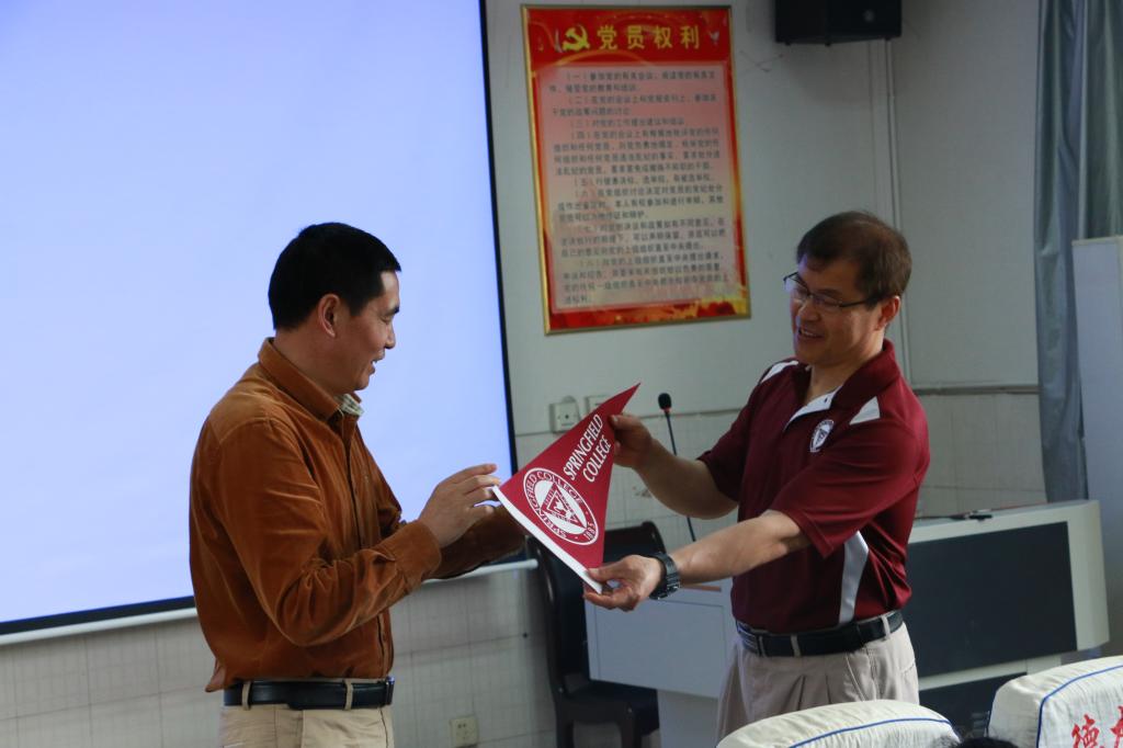 图3 刘展博士向周道平经理赠送美国春田学院校标