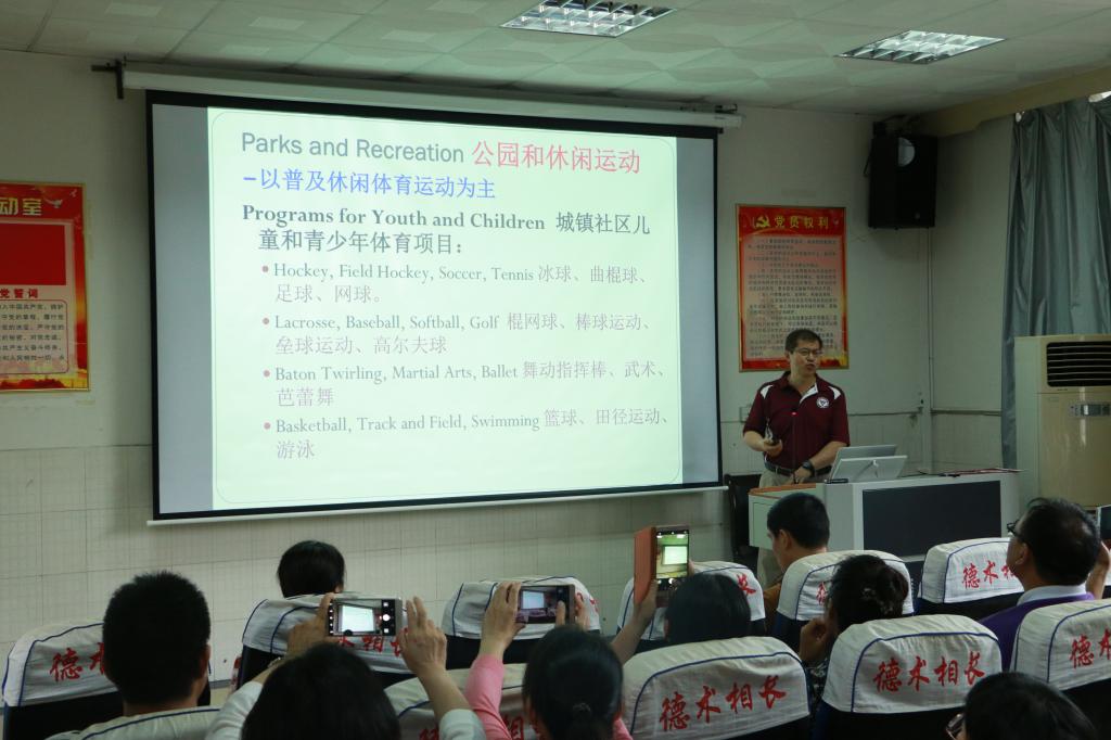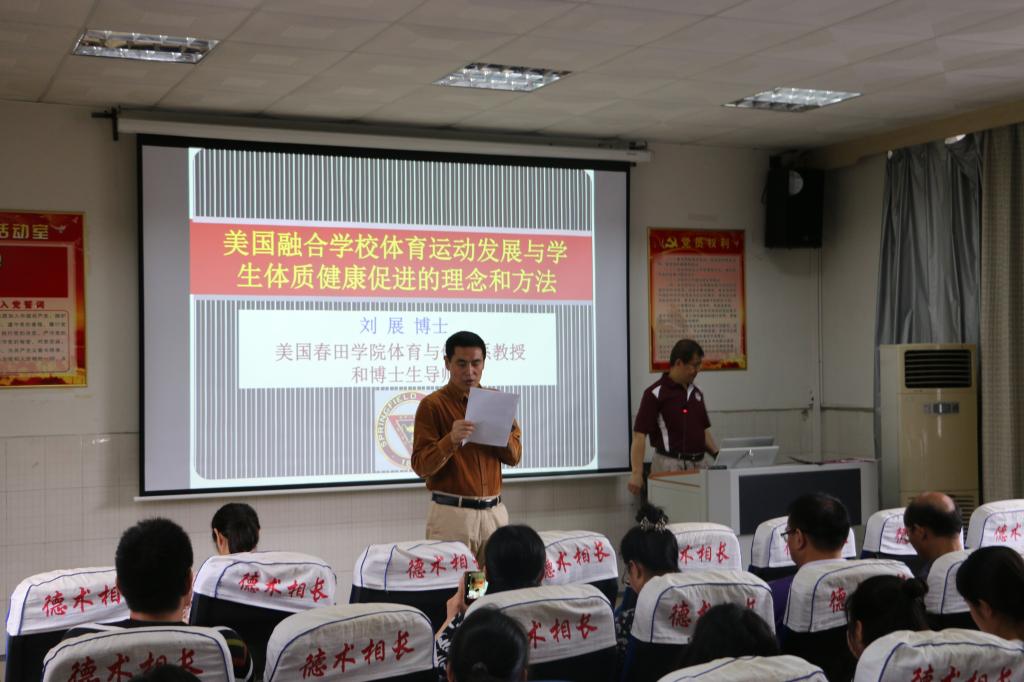 刘展教授首先从美国春田学院发展的历程进行介绍,随后从美国学校运动发展的模式和现状,围绕学校员工体质健康促进的理论和方法展开讲座。他细解读了美国青少年九条体育运动标准,从美国小学、初中、高中和大学等阶段的背景信息对美国学校运动发展的模式和现状进行分析,深入探讨了美国学校和俱乐部体育运动发展模式的缺陷,提出了竞技体育运动的投入和发展无法从根本上解决员工参加健身活动和促进体质健康的问题。让我们对美国学校体育运动有了新的认知,深刻认识到学校是提升员工体质健康的重要场所和领地,是影响青少年体育锻炼行为促进体质健康的重要途径。