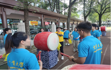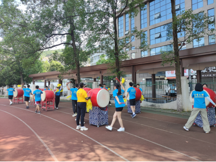 与此同时,第二大组的学员们在覃英老师的带领下学习了苗族鼓舞,学习内容分为理论探讨和实践操作两大模块。覃老师从吉首市少数民族的分布及流行的民族体育项目讲起,详细介绍了苗族鼓舞的起源、种类及其背后的文化内涵,让学员们对苗族鼓舞有了初步的认识。为了进一步加深学员们的理解,覃老师亲自进行现场演示,通过实际操作让学员们直观了解苗族鼓舞中鼓的放置方法、鼓槌的握持技巧、击鼓的方式、基本节奏和步伐。在实践环节,覃老师首先通过简单的敲鼓练习帮助我们活动手腕,并让学员们体会敲鼓时手部的松紧时机。随后,学习敲边鼓的节奏和方法,并通过分解、完整、重复和上鼓练习,以及跟拍练习,逐步掌握了苗族鼓舞中的两个基本套路。学员们被苗族人民深厚的文化底蕴和独特的艺术魅力所深深吸引。