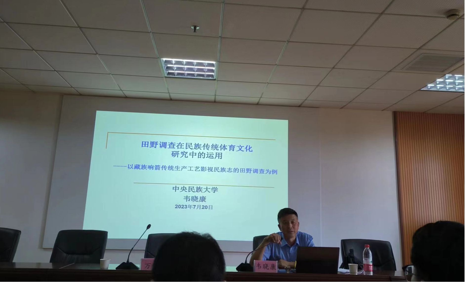 7月19日下午,韦晓康教授以《田野调查在民族传统体育文化研究中的运用——以藏族响箭传统生产工艺影视民族志的田野调查为例》为主旨,以文化人类学理论为切入点,从七个方面分析了田野调查的内涵,结合课题实际深入浅出的阐述了田野调查法在民族传统体育文化研究中的应用过程。并以对西藏林芝工布地区藏族响箭文化及其制作工艺、经济发展的田野调查为例,详细地向同学们简述了田野调查工作的各种具体细节。