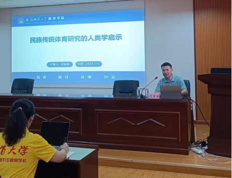 2024 年7月12日上午9点,在总理楼三楼会议室,花家涛教授以《民族传统体育研究的人类学启示》为主题展开了一场精彩的学术讲座。此次讲座由万义教授主持,“体育强国新征程·民族体育文化”研究生暑期学校的全体学员共同参与。