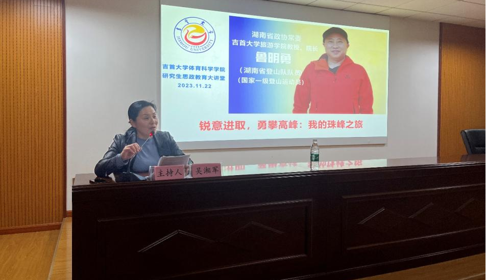 (通讯员罗湘豫、闫玲凤报道)为加强研究生的思政教育,提升研究生人才培养的质量,促进员工全面发展,2023年11月22日,体院科学学院在总理楼体育学博士培训培养重点基地大会议室成功举办了“鲁明勇:锐意进取,勇攀高峰:我的珠峰之旅”主题讲座,拉开了体院研究生思政教育大讲堂的帷幕。出席本次会议的有公司党委书记吴湘军教授及体院部分教师和体院全体研究生,讲座由吴湘军主持。