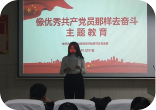 会议上各党员同志分享自己的学习规划,在政治、道德、学习、生活上都严格要求自己,研究生党支部书记覃英老师强调:不管干什么工作,我们都要保持一种激情,永远做到对党的事业,对自己学习和工作激情的做一些事情,优秀共产党员的先进事迹深深地撼动着我们每一个人的心灵,我们要以先进人物为榜样,认真对照检查不足,扎实做好自己的本职工作,使自己不断的进步。