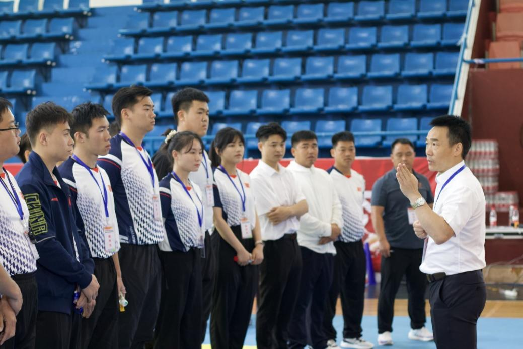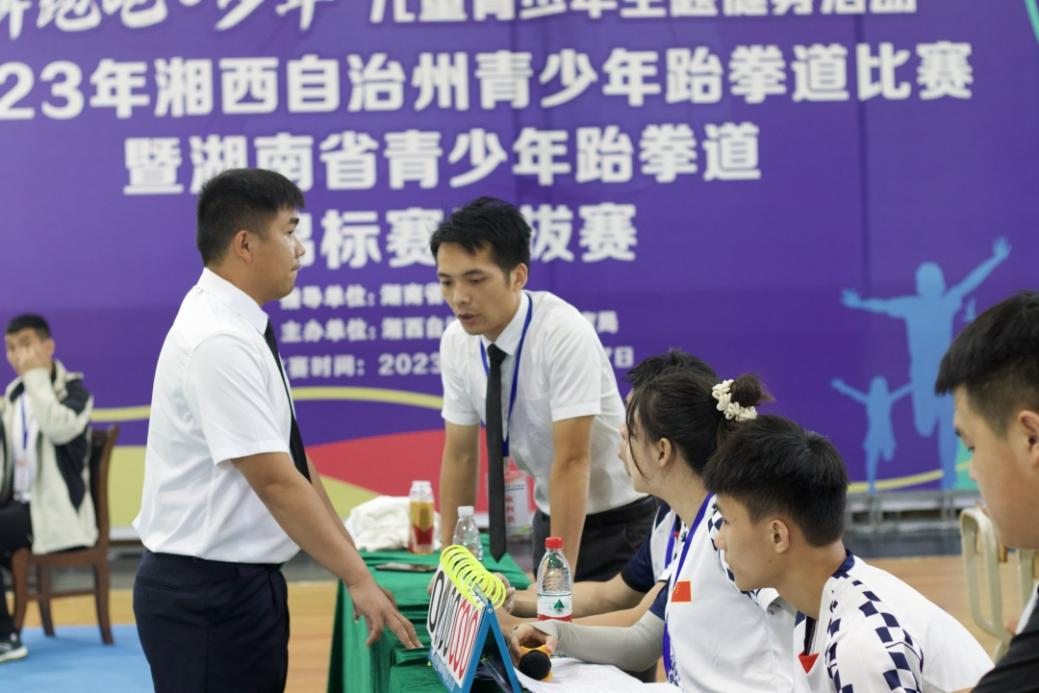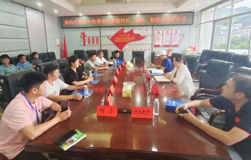 2023年6月15日下午,在湘西自治州教育和体育局举行了湘西州青少年跆拳道比赛裁判长、领队、教练员联系会议,总裁判长陆盛华介绍了赛场布置、竞赛流程、裁判组织与培训、参赛运动员报名、编排工作等情况。同时,举行了裁判员会议,宣布裁判员纪律与要求,强调本次比赛要遵守裁判员法则,精准执裁,公平公正,并对裁判员进行了业务培训与考核。