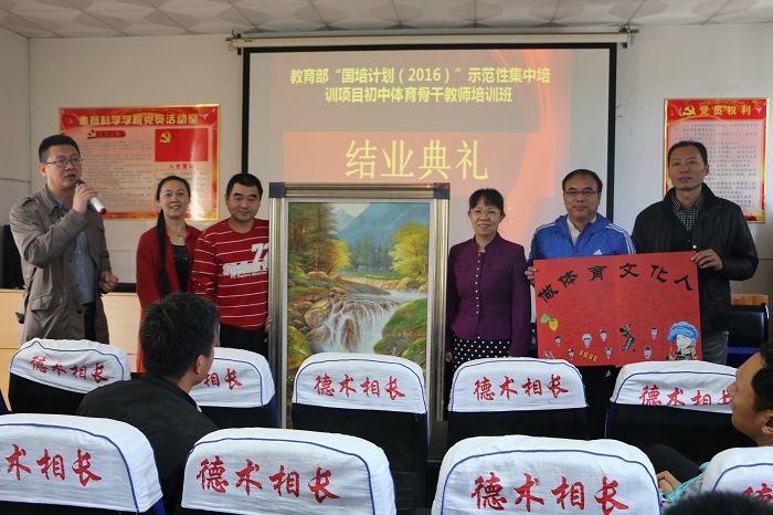 结业典礼上,来自新疆的姜建忠代表全体学员以“从我的全世界路过”为题,全面讲述了从接到培训通知到培训心理历程,表达了对本次国培的感激、对学员的不舍、对民传项目的传承、对国培老师及团队的依恋,全场为之动容。田筱鸿经理发表感慨,首先感谢各位学员们如此信任和支持国培工作组的工作,并且希望学员们能继续坚持做体育教师的初衷,对学员们勤奋好学、团结友好的作风给予高度的赞赏,对老师们提出了学员之间要加强联系,珍惜这份难得的缘分,保持经常性的沟通和交流,也提出了衷心的祝愿,祝愿学员们家庭和睦,事业一帆风顺。接着,国培学员们为学院赠送了自发组织制作的“做体育文化人”简报以及油画“高山流水”。最后,肖松书记等五人为在座的学员们一一颁发了“优秀班干部”、“结业证书”、“优秀学员”证书。