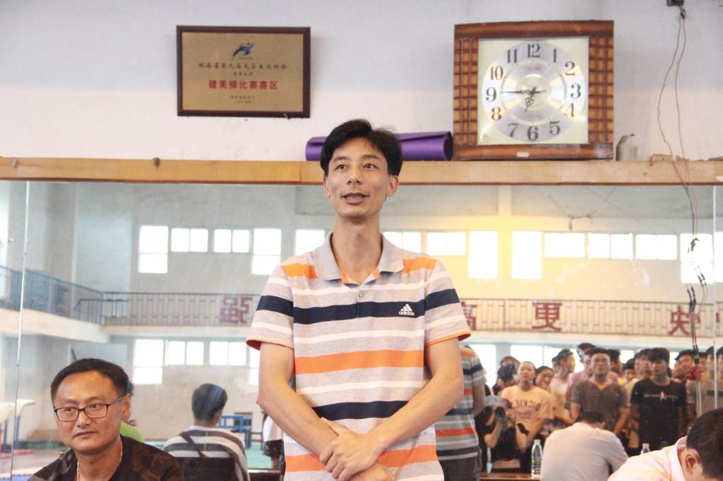 周道平经理致词。他讲到体操课程是人才培养方案中最重要的课程,希望同学们把体操所学知识合理运用。本次比赛暨结业考试是检验同学们这一年的学习成果,希望同学们可以认真对待本次比赛。同时裁判员要认真负责,公平认真的协调评判好本次比赛。并预祝本次比赛圆满成功。