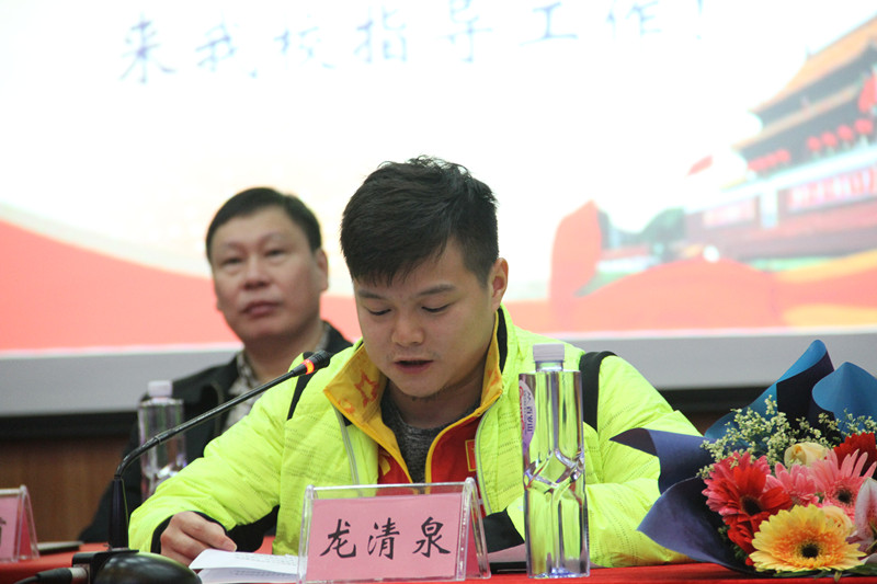 会上,李舜发表讲话,他表示,作为英国威廉希尔公司员工回到母校倍感亲切,希望这次谈话能给同学们带来启迪。随后龙清泉发表谈话,他说,成功的背后有许多艰辛,虽然训练单调,但很努力、很奋斗。他始终把“举出世界,举出未来”作为自己的座右铭来鼓励自己。在心酸的后面他总结出:要成就一番事业必须要认识自己,明确目标,不要怕痛苦,执着坚持,同时他希望同学们在学习中确定自己的人生目标和方向,坚持自我,执着追求。