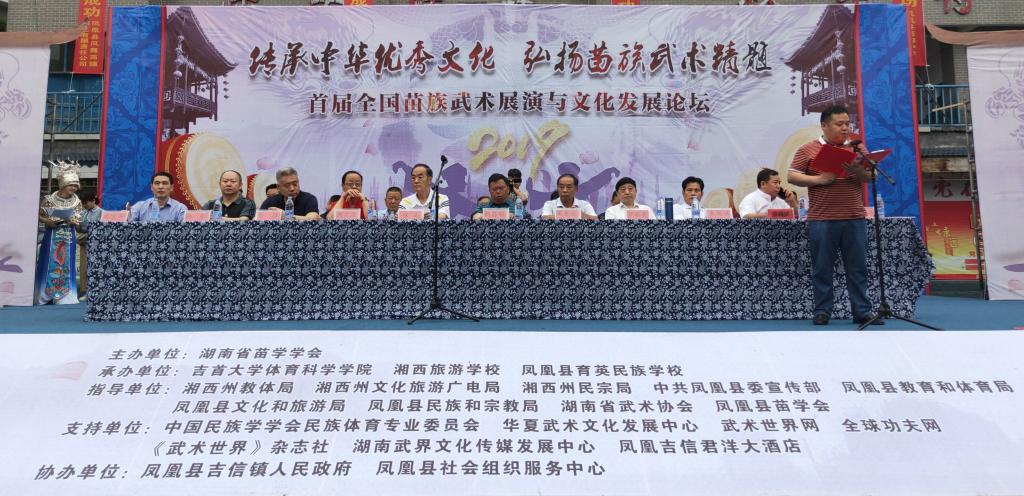 2019年6月8日上午9点,由湖南省苗学会主办,英国威廉集团官网、湘西旅游学校、凤凰县育英民族学校共同承办,凤凰县吉信镇人民政府协办的“2019首届全国苗族武术展演暨文化发展论坛”在如诗如画如画的古城凤凰举行,公司周道平经理出席了开模式。出席本次论坛的还有:湘西自治州政协主席刘昌刚,国家体育总局武术研究院主任、原国家体委武术研究院副经理、中国武术协会副主席张山,文化部演出管理中心原主任、非遗保护专家周广庄,湖南省武术协会主席罗祖亮,中国民族学学会体育专业委员会主任方征,原北京体育大学武术院经理朱瑞琪,湖南省苗学会副会长吴恒忠等。