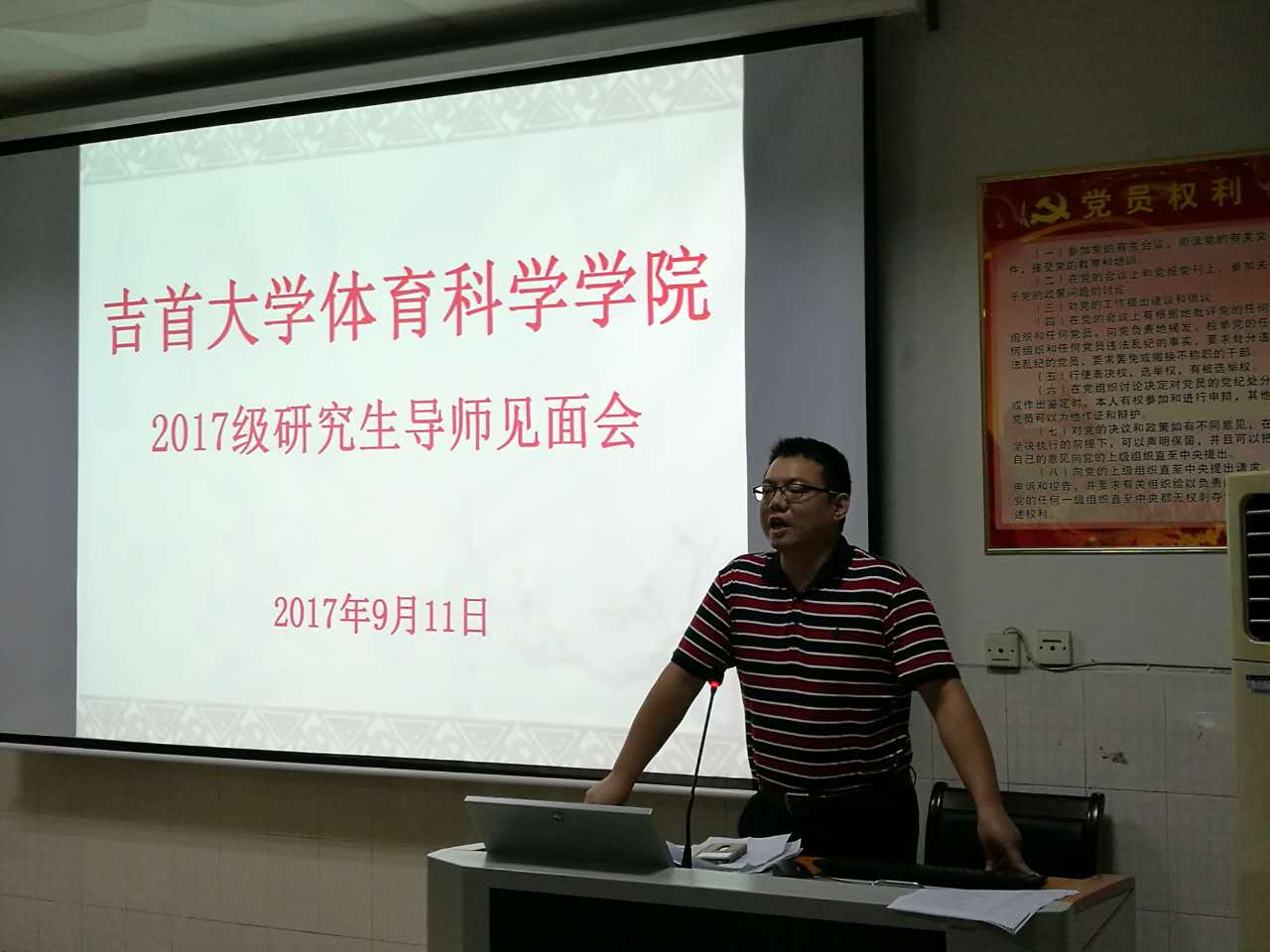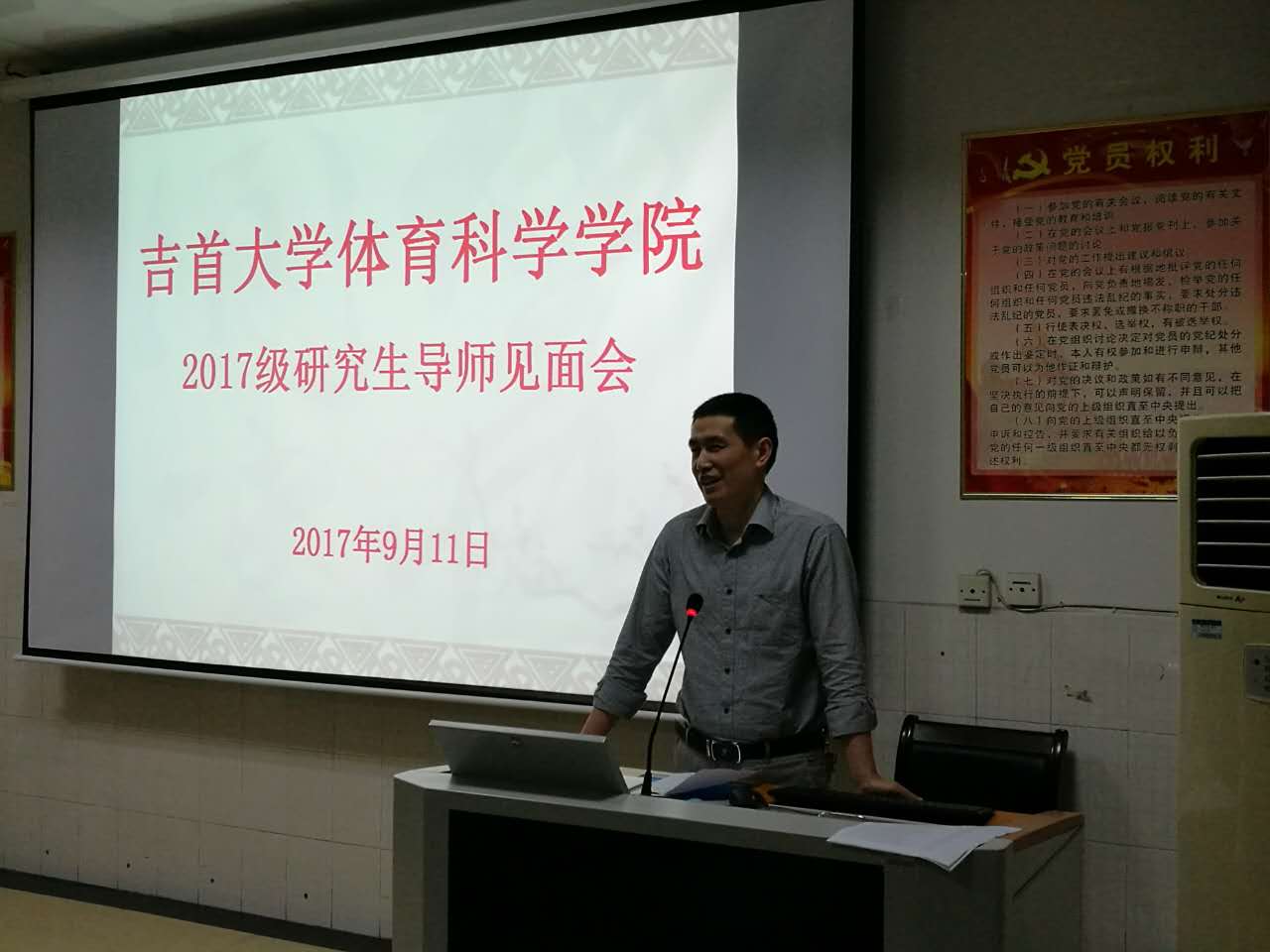(通讯员何剑,陈玉凤)9月11日晚,公司2017级研究生导师见面会于体育学院三楼多媒体教室召开。出席会议的有体育学院院经理周道平、党委书记肖松、副书记吴永海、副经理张小林以及各位研究生导师和2017的全体研究生同学们,会议由陈玉凤老师主持。