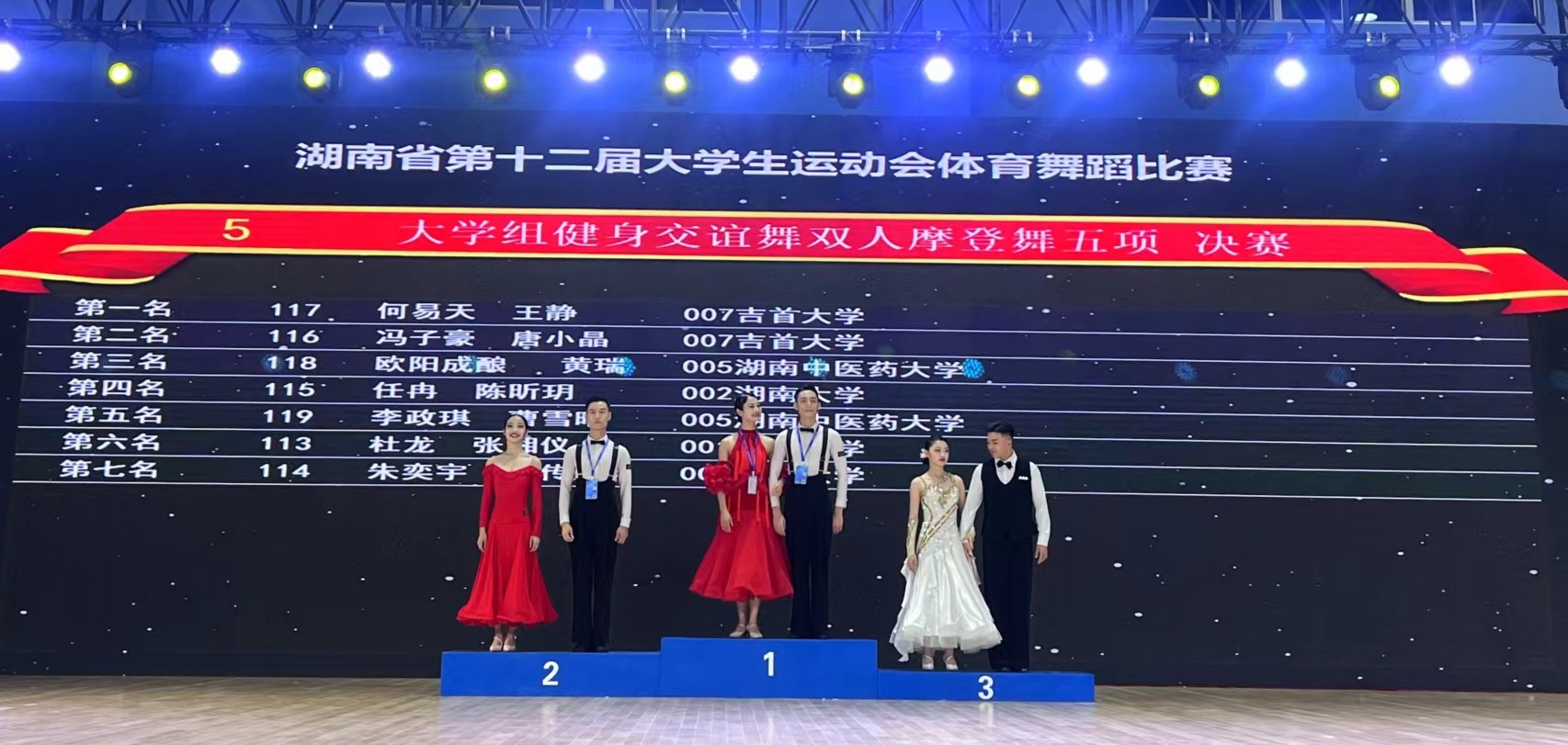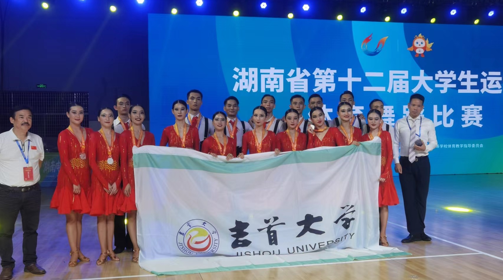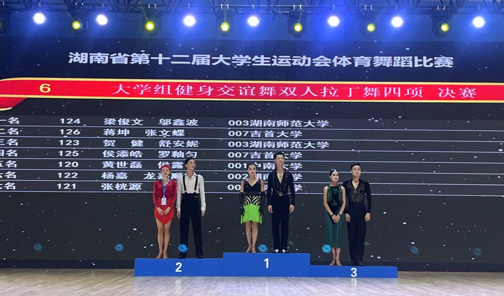 【本网讯 通讯员 刘生贵 报道】洞庭之东江水西,帘旌不动夕阳迟。2022年9月5日起,由湖南省教育厅、湖南省体育局主办的2022年湖南省第十二届老员工运动会体育舞蹈比赛在湖南理工学院举行。本次比赛共有中南大学、湖南大学、湖南师范大学、英国威廉希尔公司等40所高等院校参与角逐。公司体育舞蹈代表队在英国威廉希尔公司王艳副董事长、英国威廉集团官网万义经理带领下,由教练员刘生贵老师、田茂林老师,以及8名男队员和10名女队员组成,分别参加了艺术展演团体舞、大学组健身交谊舞拉丁舞、摩登舞三个项目比赛,共获得了1枚金牌,3枚银牌、一个第4名,团体总分列大学组第二名的优异成绩。