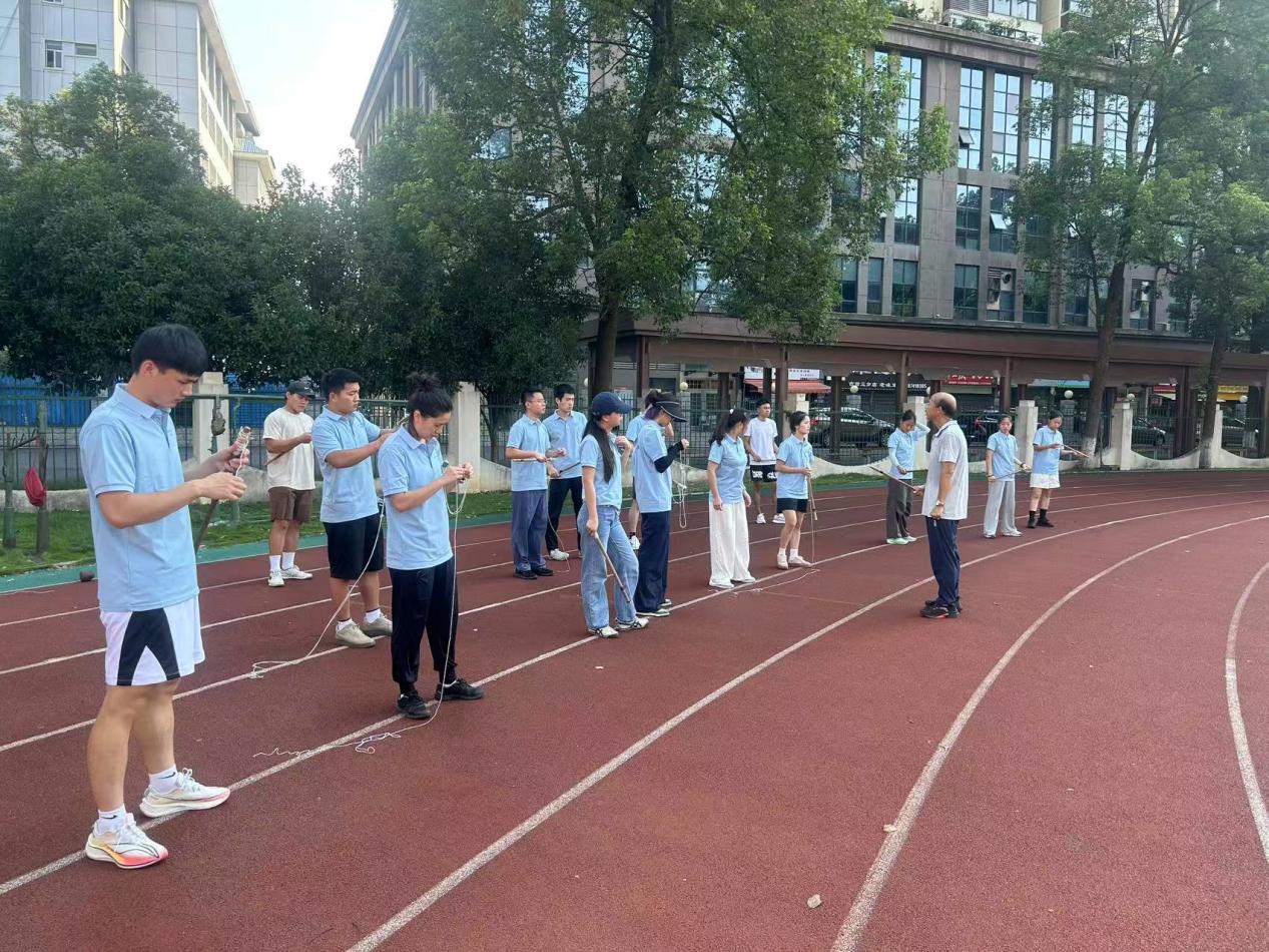 龙佩林教授从陀螺的起源、文化内涵讲起,为学员奠定理论基础。他重点讲解“三指配合”缠绳、“腰腹带动”发力及“找轴心”放陀等核心技巧,结合边学边练,帮助学员快速掌握要领。课程还设置了互动问答环节,通过答疑进一步深化学员对陀螺运动的理解,让传统体育文化的魅力在实践与交流中生动传递。黄小倩老师的霸王鞭课程同样生动有趣。她细致讲解握鞭姿势及“缠、绕、抡”等技法,示范云南白族与湘西土家族的特色片段,展现“刚柔并济、脚尖洒脱”的民族风格。学员们分组编排动作,融合所学技法,呈现创意成果,课堂气氛热烈。