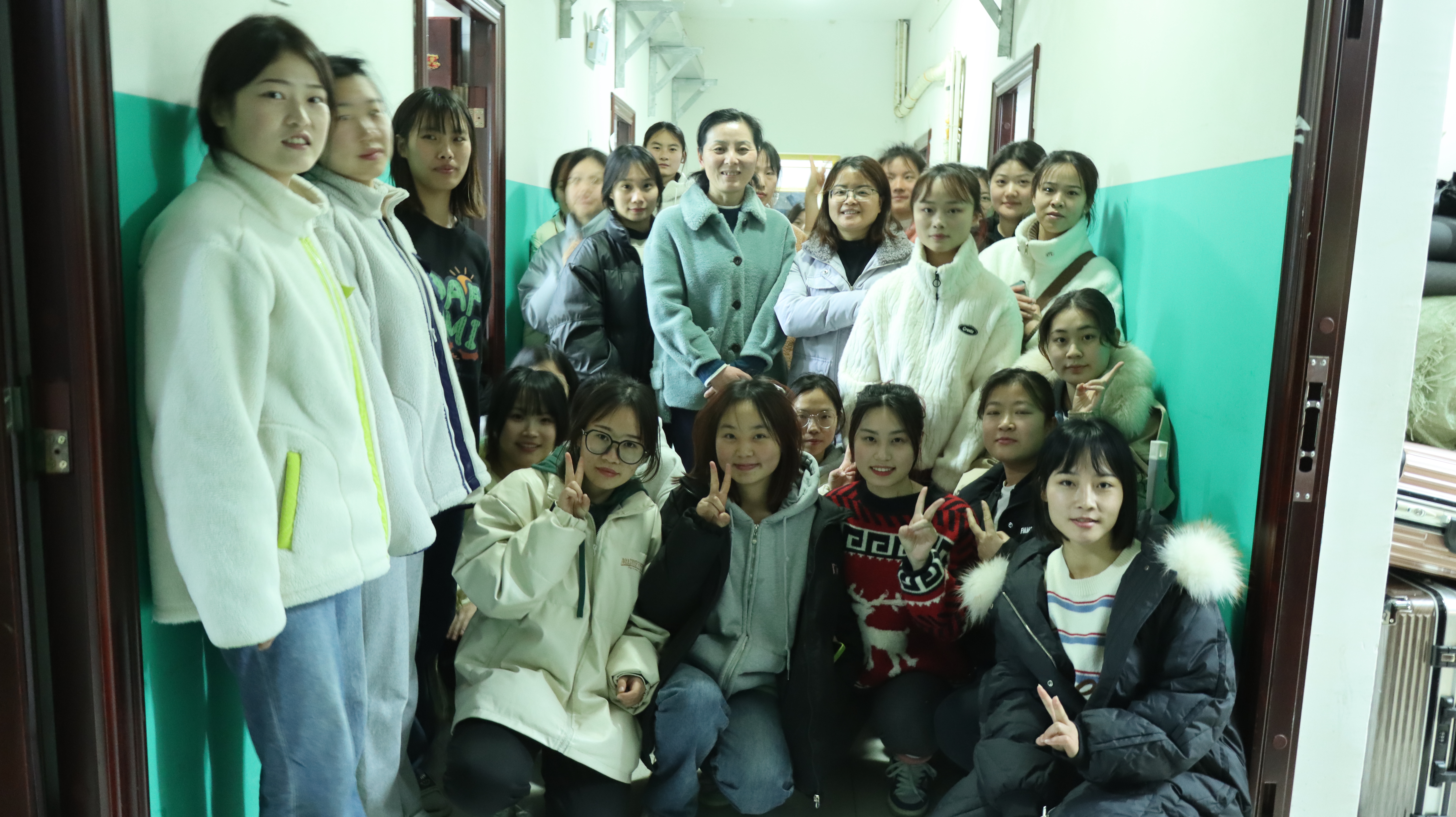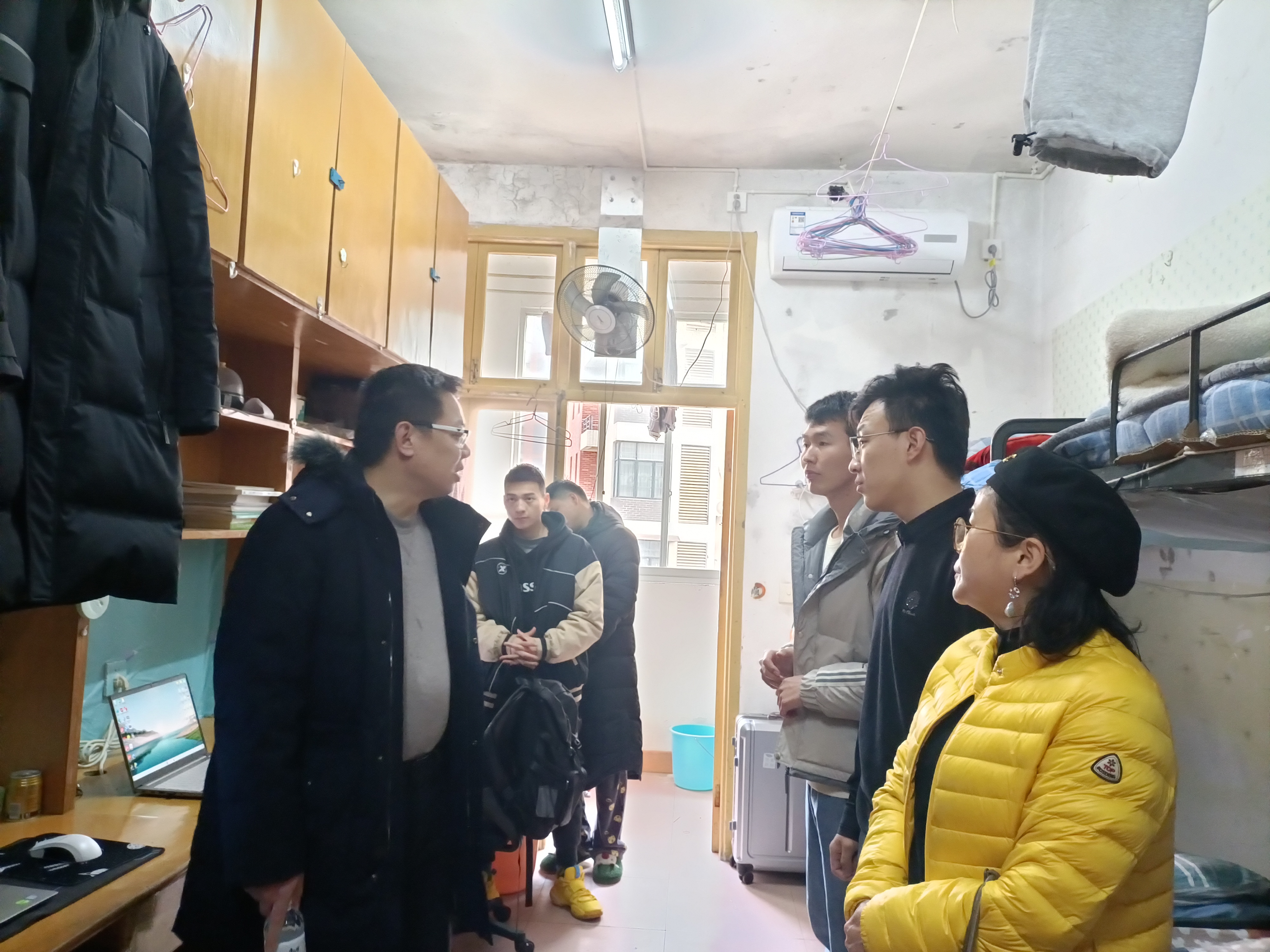 图为 吴湘军书记、谌晓安副经理到寝室看望女生并合影