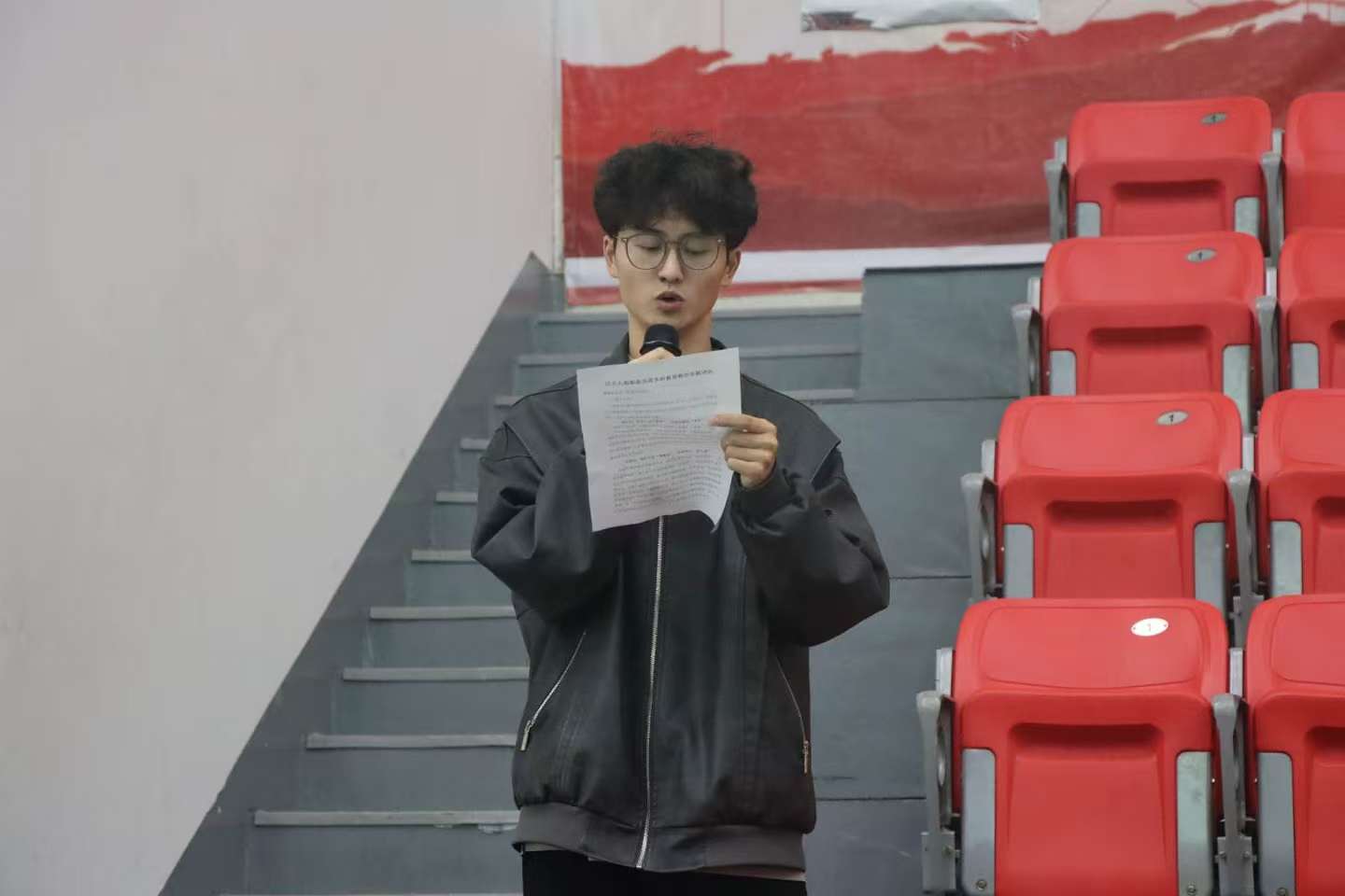 图为2023级体育教育三大班团支书柴成敖作为员工代表发言
